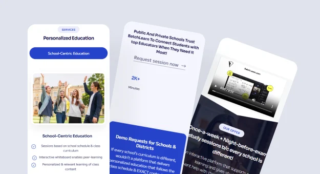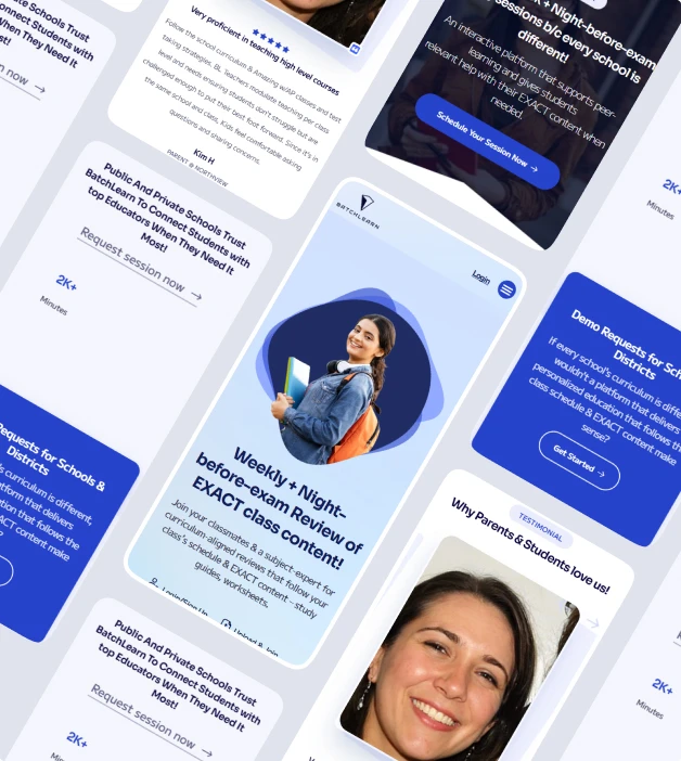 BatchLearn.com is a school-specific platform that connects students with teachers to help them with class content, guides, and test reviews. The platform allows students to request sessions for exam preparation, creating a seamless bridge between educational resources and real-time assistance from teachers.